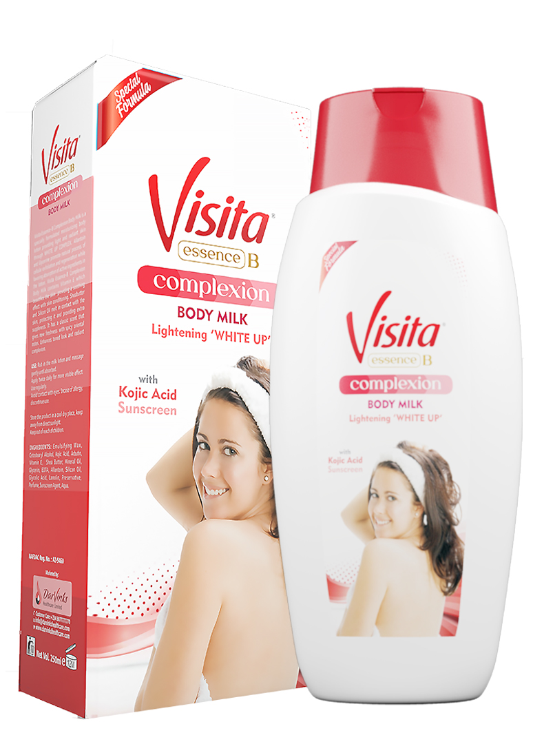 Experience Radiant and glowing skin through our Visita Essence-B Complexion Body Milk with ‘WHITE UP’ complex providing you with an enhanced and radiant complexion. Enriched with Bearberry extract (arbutin), Vitamin E, Shea butter, Kojic acid, Glycolic acid, and SPF, Visita Body milk eliminates dark spots, scars, and uneven skin tone while keeping your skin moisturized and protected.